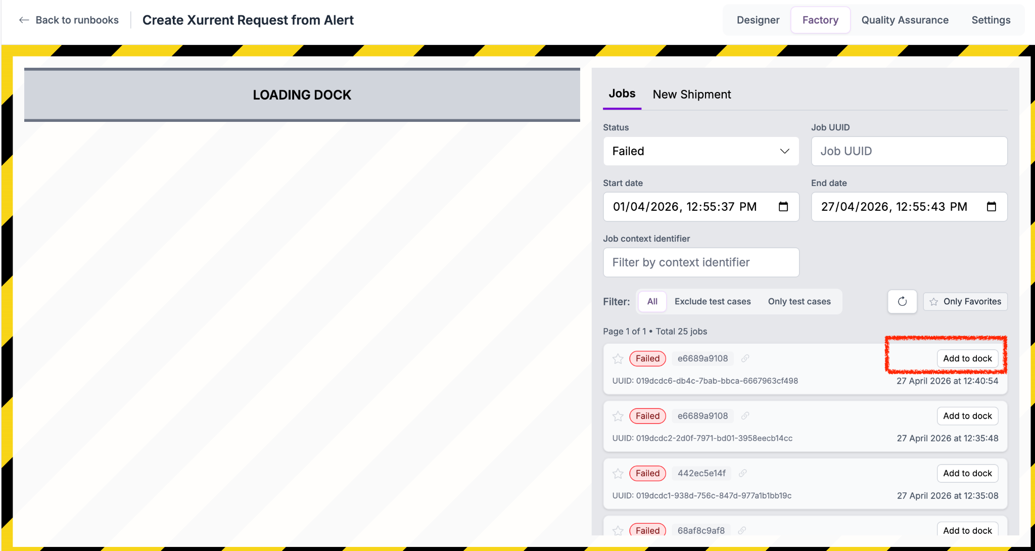 3. Once the failed jobs are displayed, select a job and click Add to Dock.