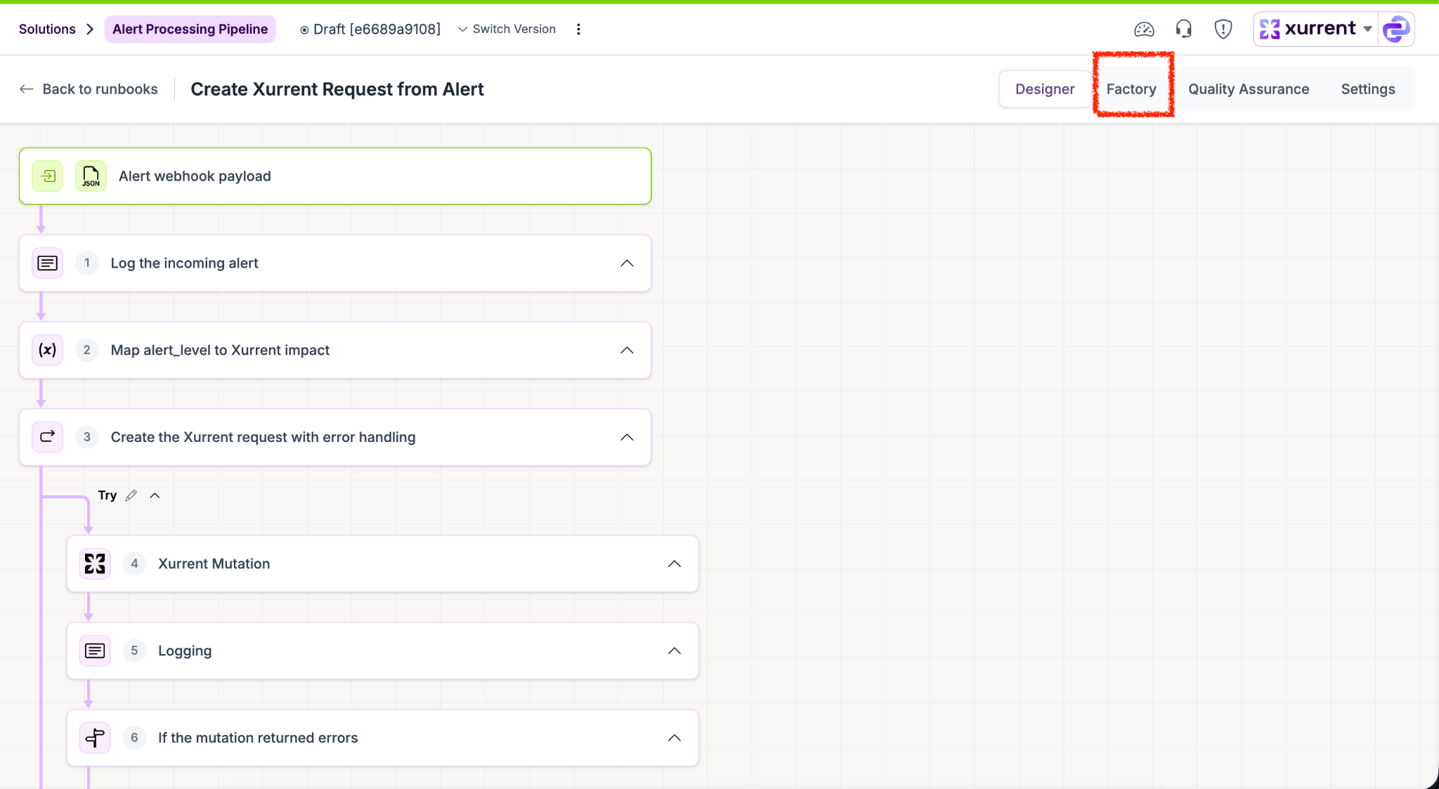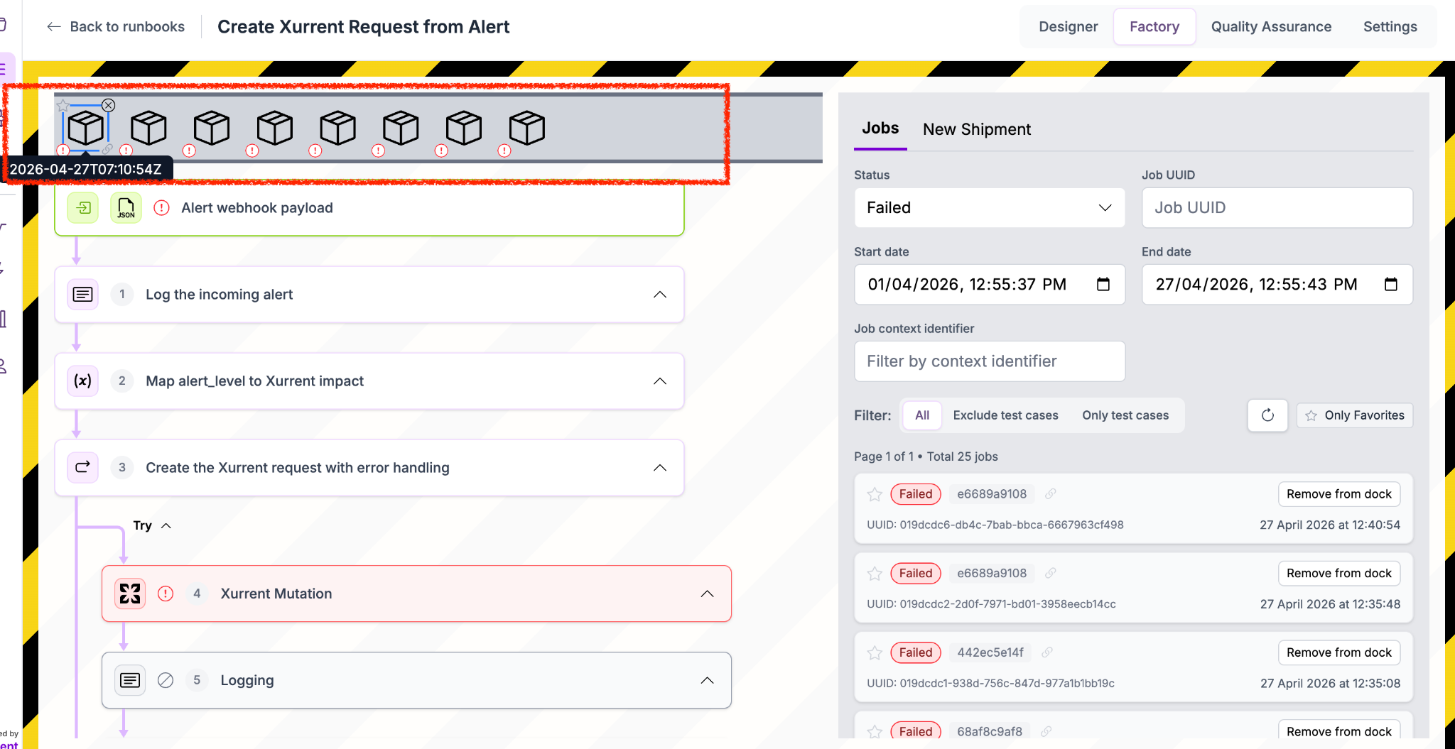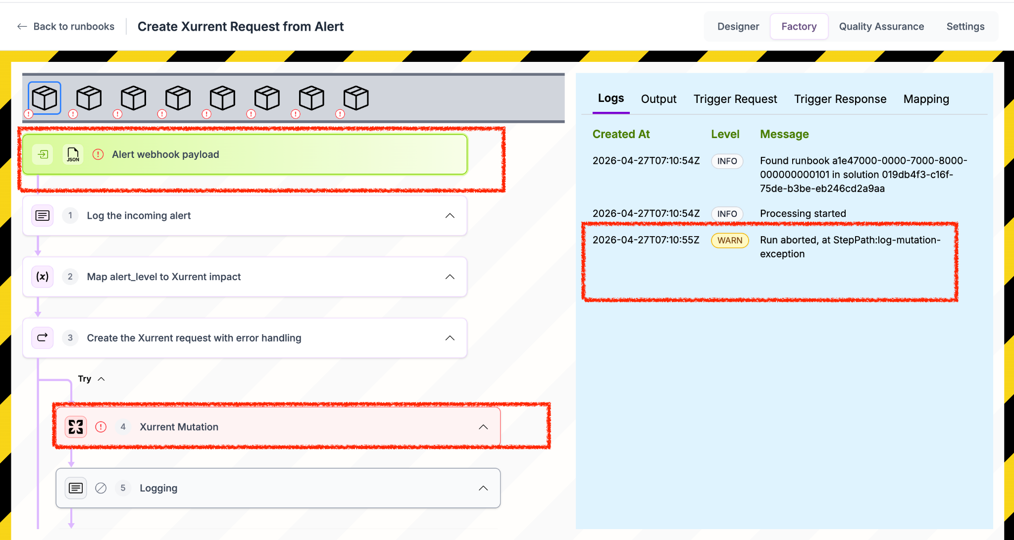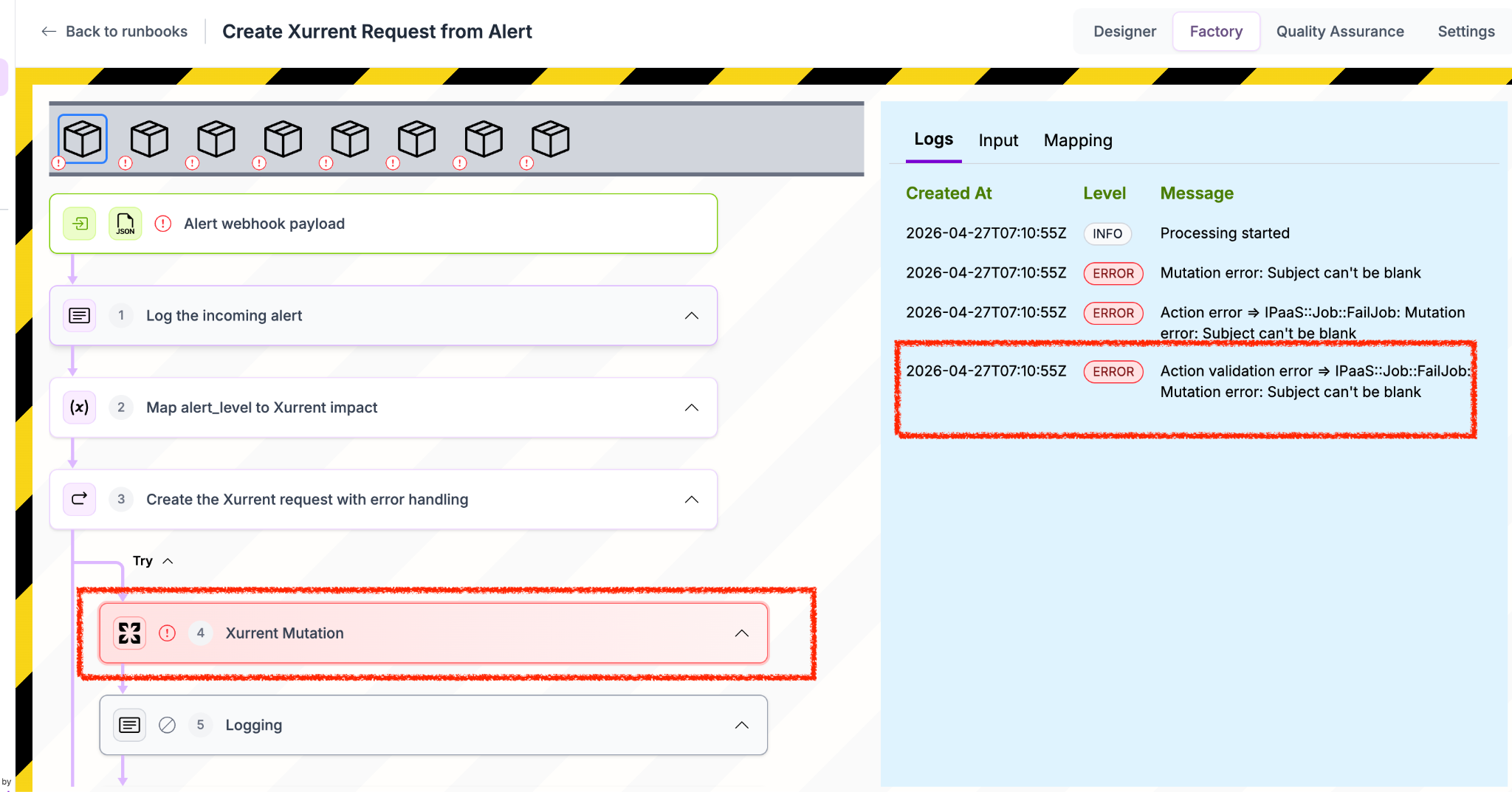 • Click on the Xurrent mutation step (highlighted in red when an error occurs).