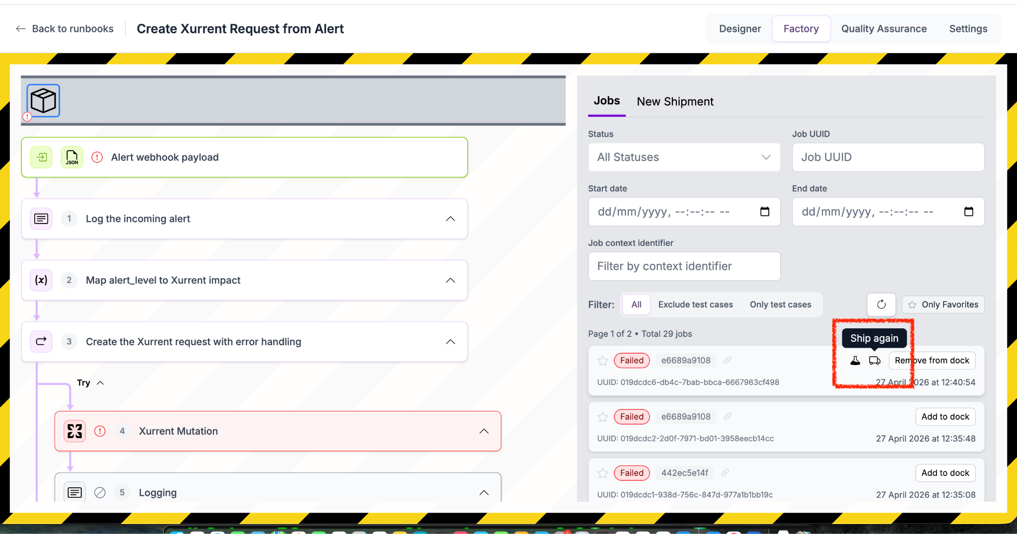Learn how to use the Factory to track job executions, investigate failures, and reship jobs after fixing issues to streamline troubleshooting.
