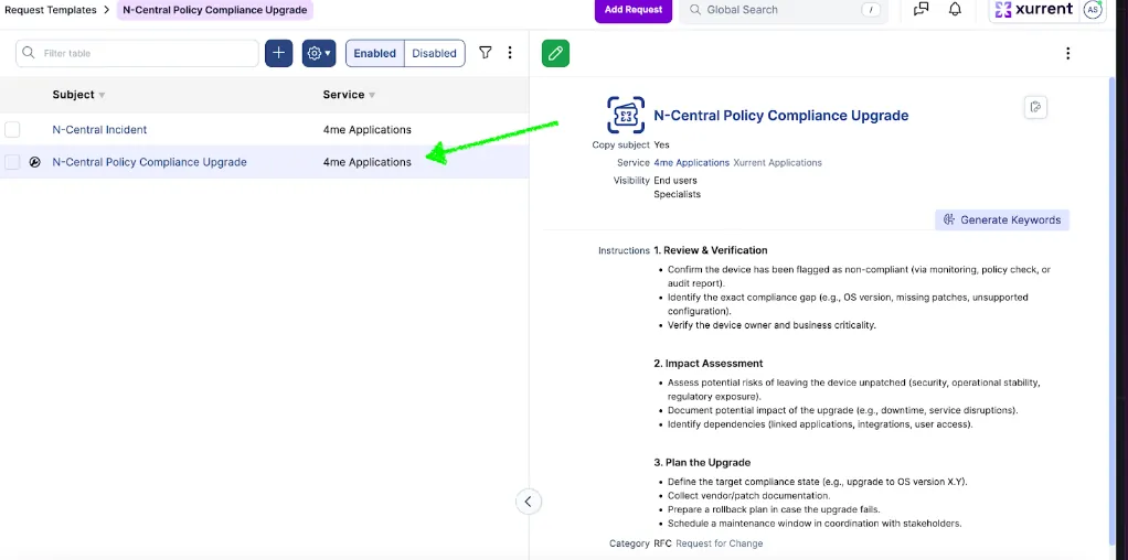 The request_template_name and service_instance_name values must match the subject and service instance name configured in the Xurrent app, as shown in the screenshots below. When these values are provided in the N-Able custom tags, they are used to create the ticket with the corresponding configuration.