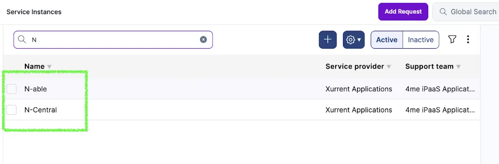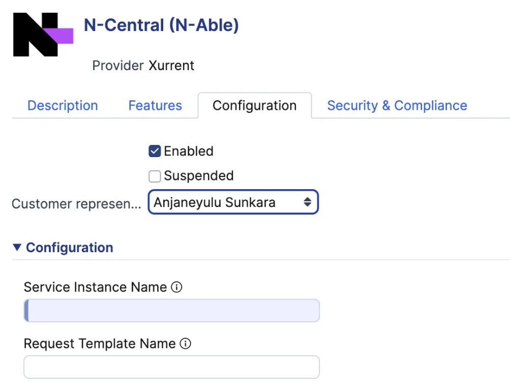 - Enter the name of a service instance from your Xurrent account (e.g., “N-Central” or “N-Able”)