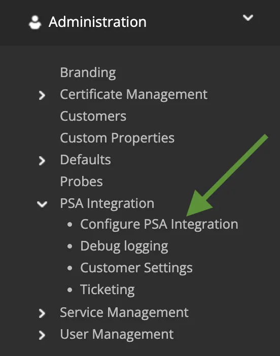 - Navigate to:Administration → PSA Integration → Configure PSA Integration