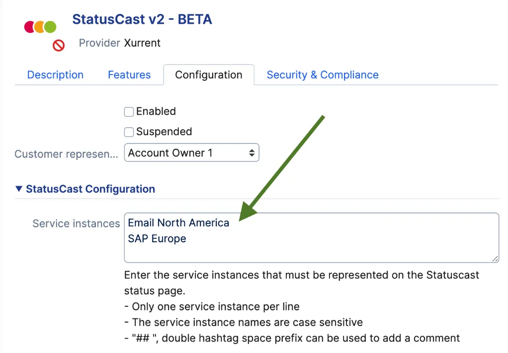 This field must be populated with a newline separated list of the names of the service instances that should be exposed in StatusCast. Only top incident requests that are related to those service instances will be reported in StatusCast.