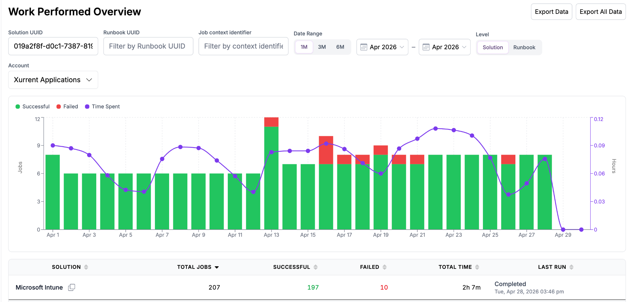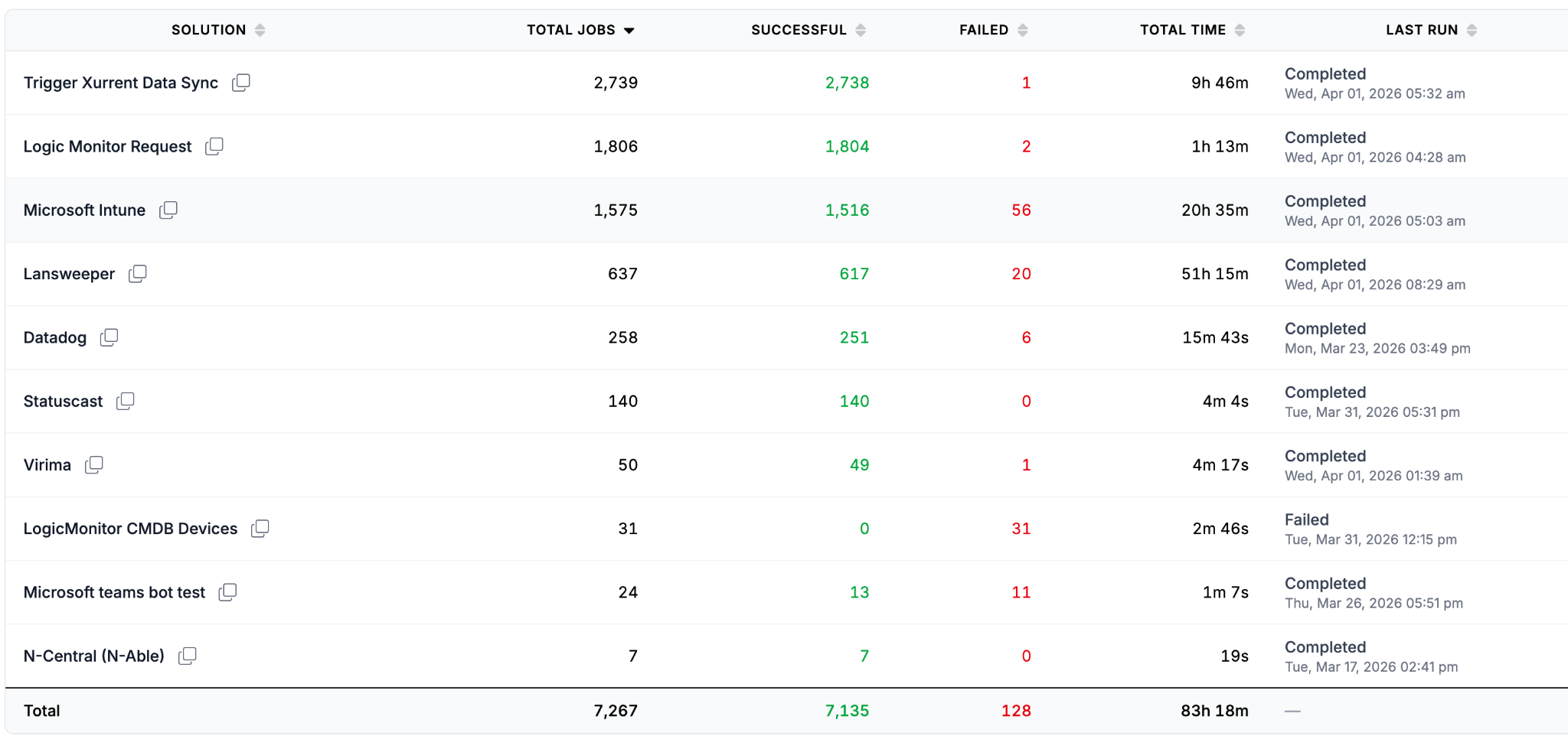 - Level Toggle: Switch the view between Solution level (grouped by integration) and Runbook level (individual workflow scripts).