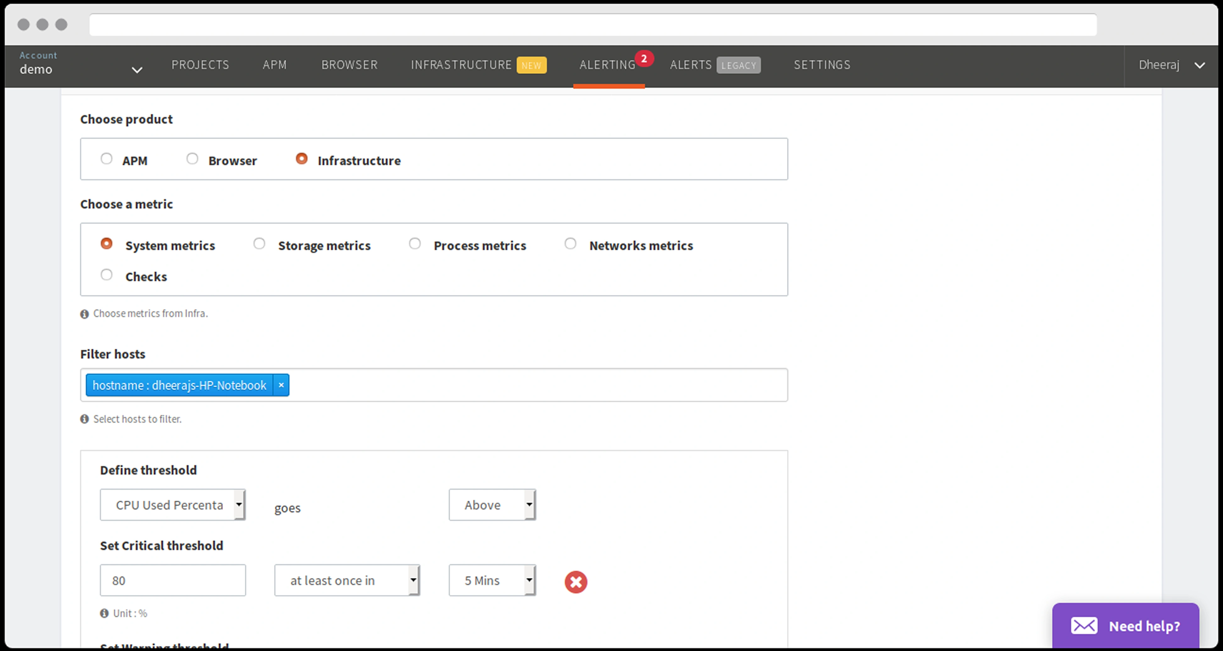 10.Select the product and the metric. Set a threshold for Critical and Warning.