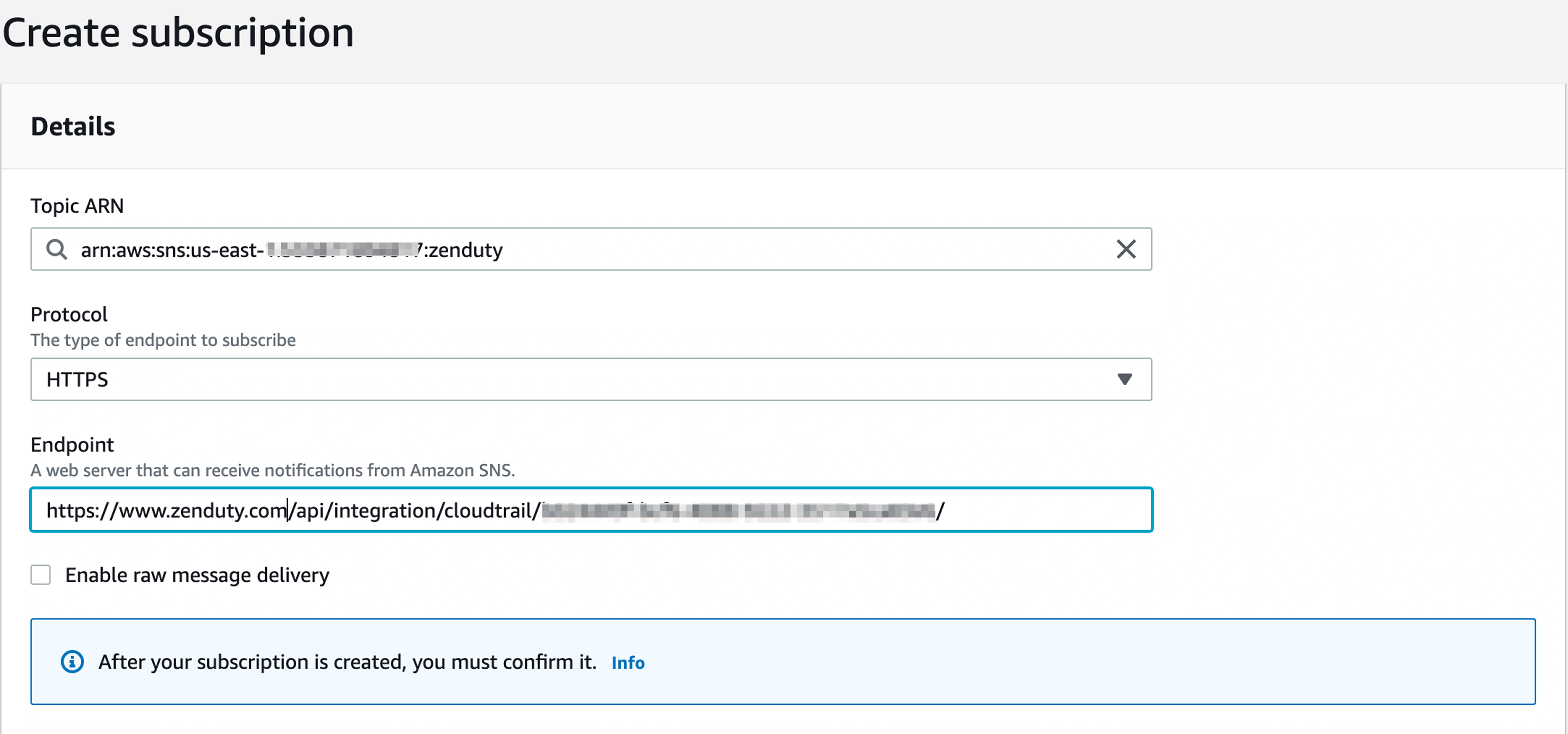 - In the Topic ARN, choose the topic created in Step 1. Select the protocol as HTTPS. In the endpoint field, paste the Webhook URL you copied earlier.