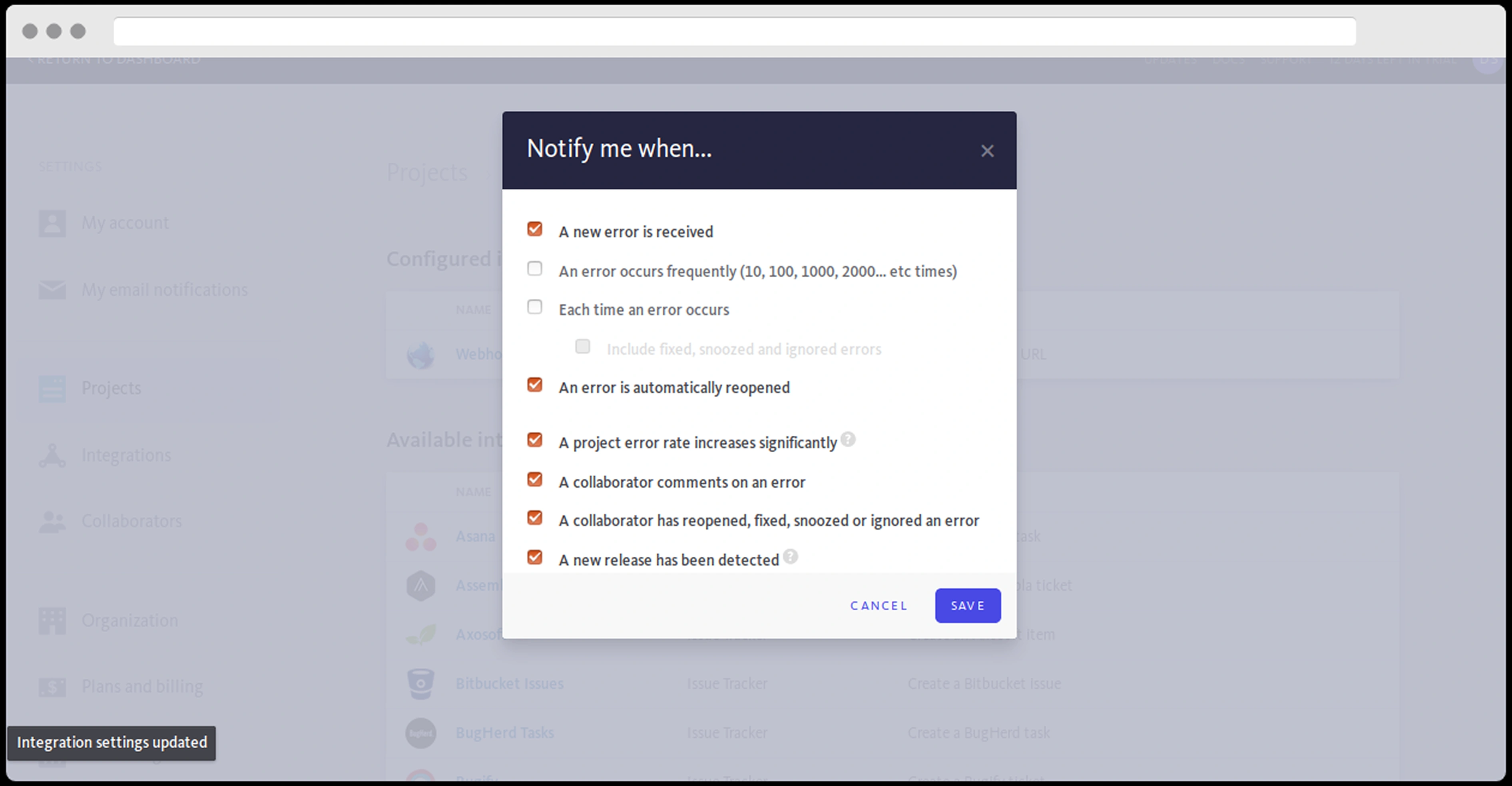 3. Go to Integrations and then Add New Integration. Give it a name and select the application Bugsnag from the dropdown menu.