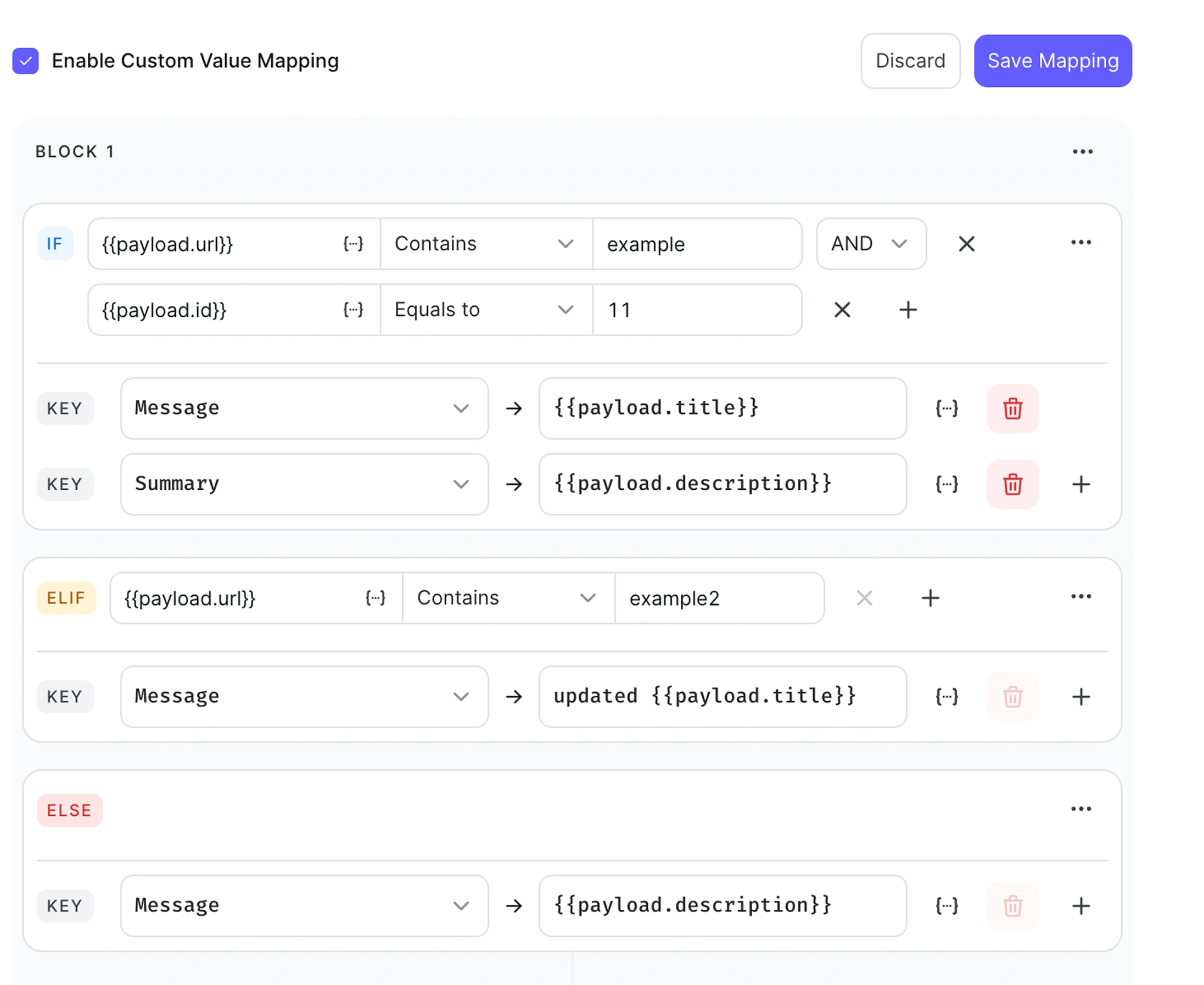 Enabling Custom Value Mapping will change how payloads are processed, which could affect your existing alert rules. Any rules referencing payload keys (e.g., {{payload.source}}) must now use the updated format: {{payload.payload.source}}.