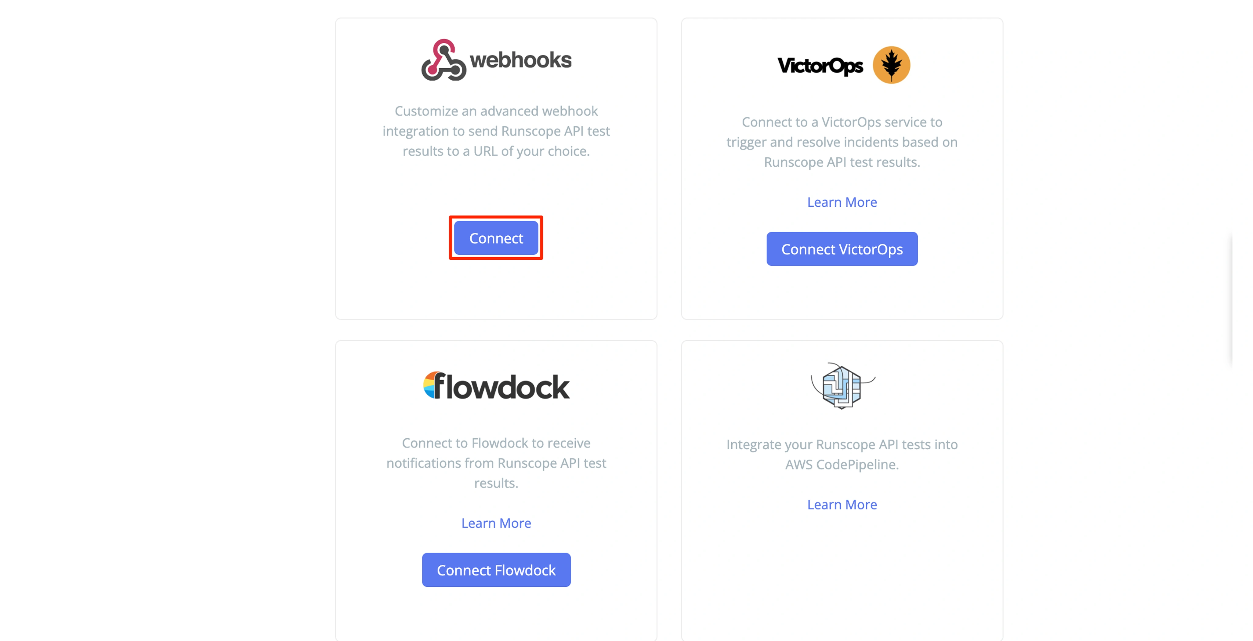 - Then, click on the Integrations tab. Click on Add Integrations and search for Webhook. Click on Connect to create a webhook integration.