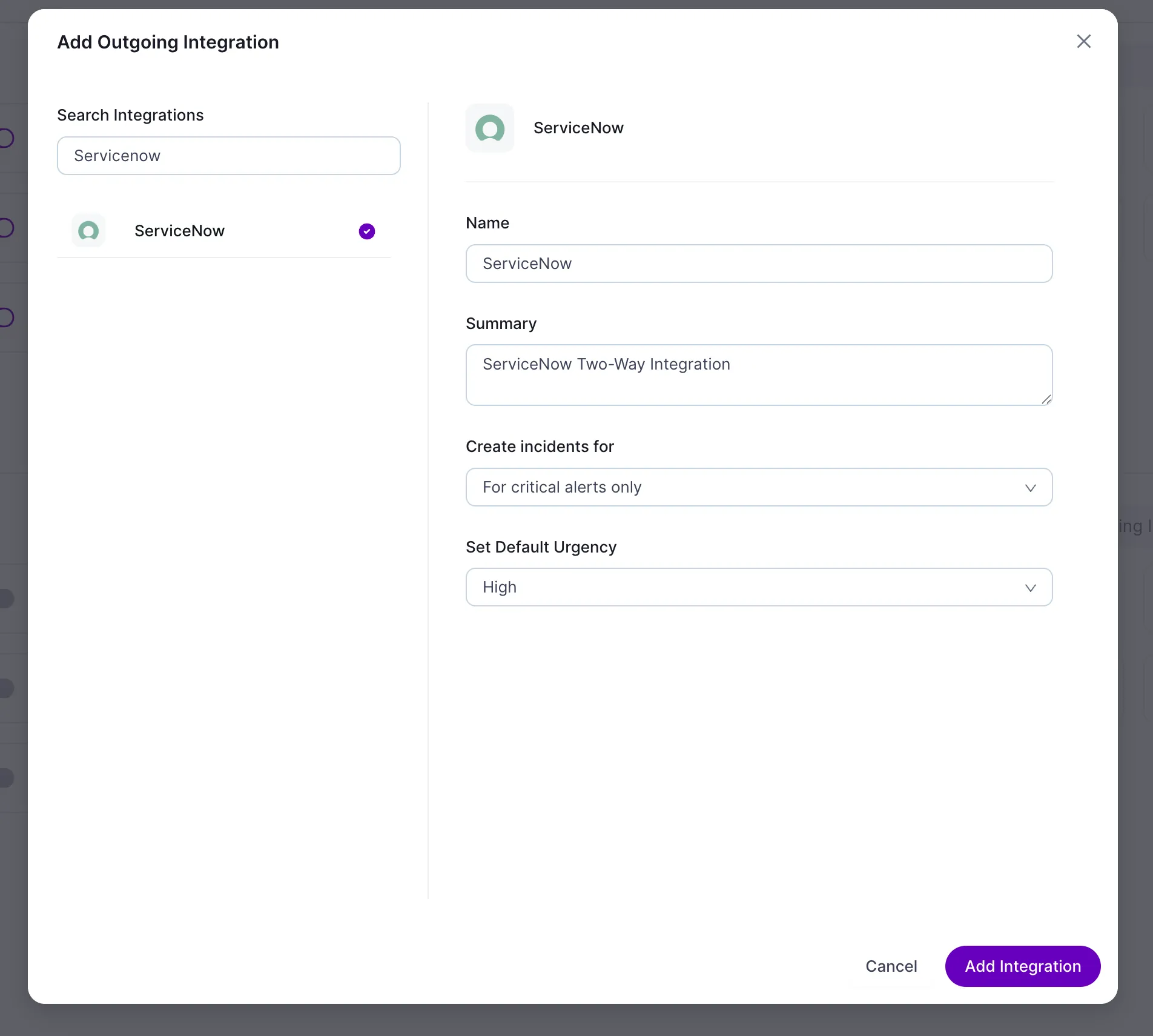 - Search for ServiceNow → Add Integration.