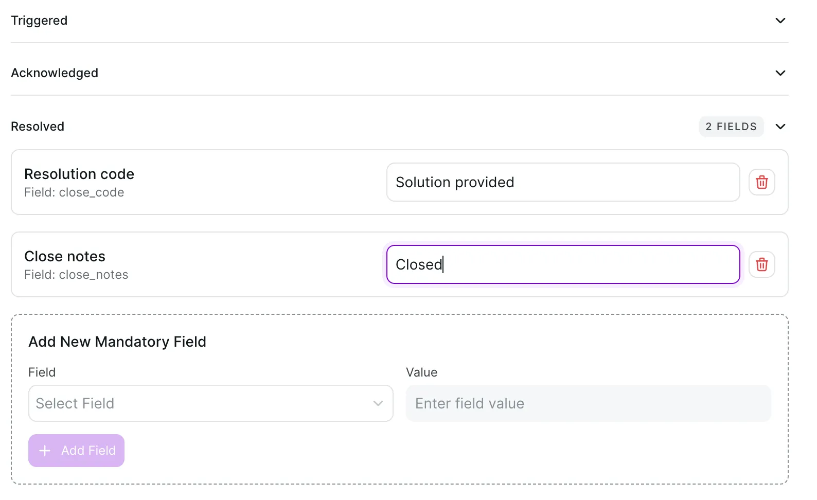 Mandatory fields for acknowledge/resolve actions