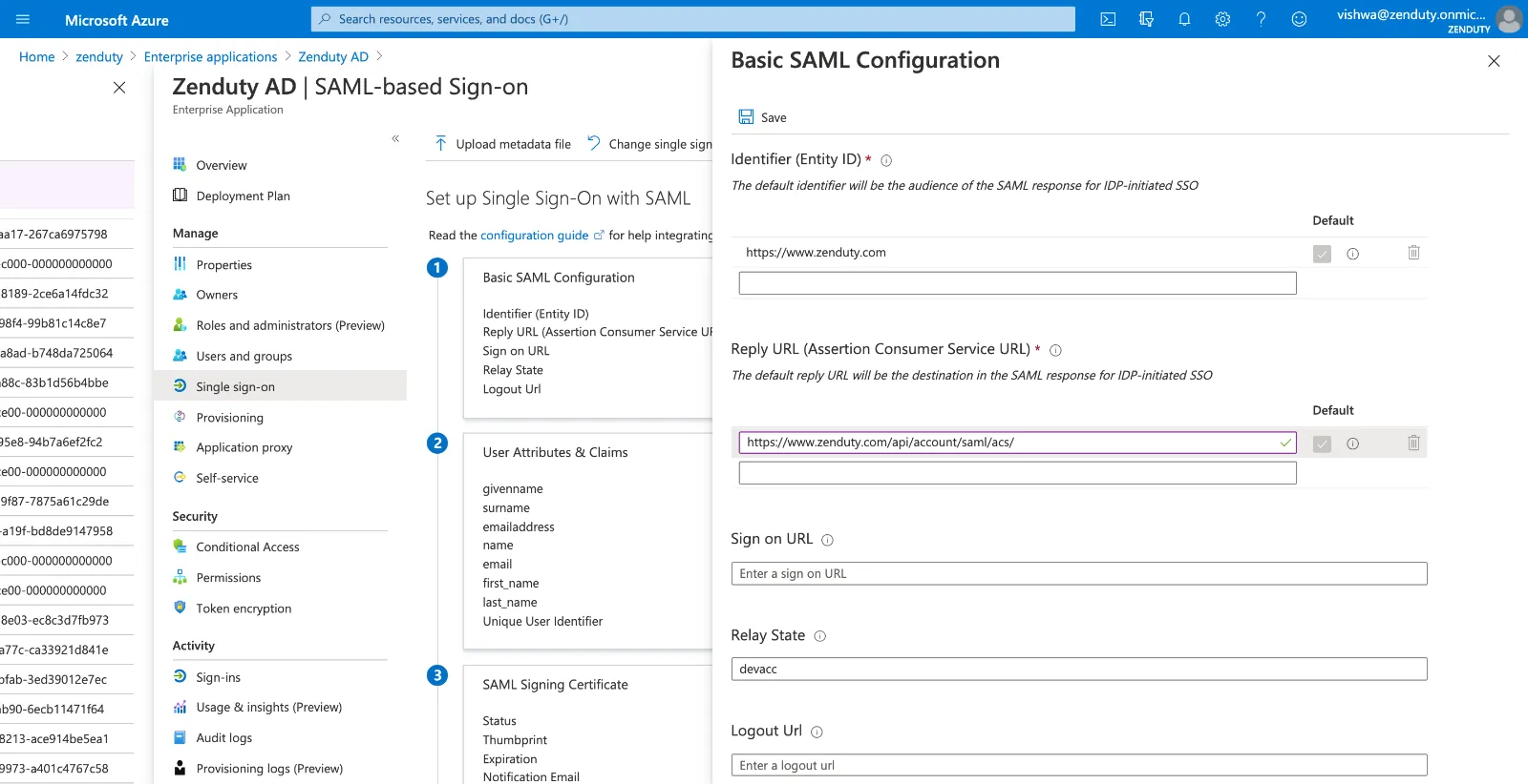 - In the Reply URL(Assertion Consumer Service URL) input box enter the value - https://www.zenduty.com/api/account/saml/acs/