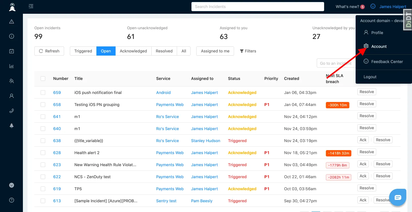 - In the Xurrent IMR tab, click on your name in the top right corner, which will reveal a dropdown with your account's domain name. Copy your account domain name for later use.