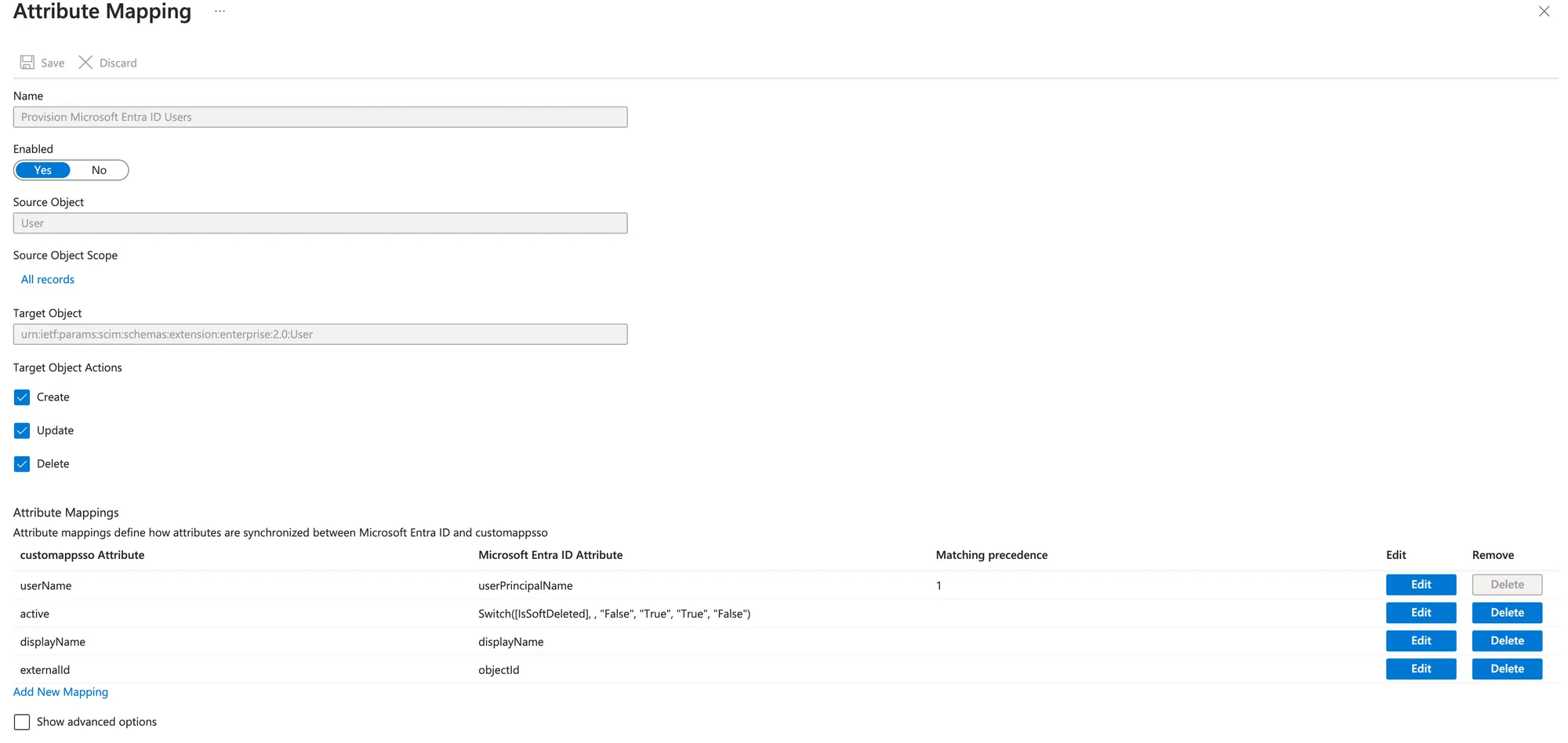 - Toggle Enabled to Yes, Ensure Create, Update, and Delete actions are selected and map the user attributes as shown below and save the Attribute Mapping.
