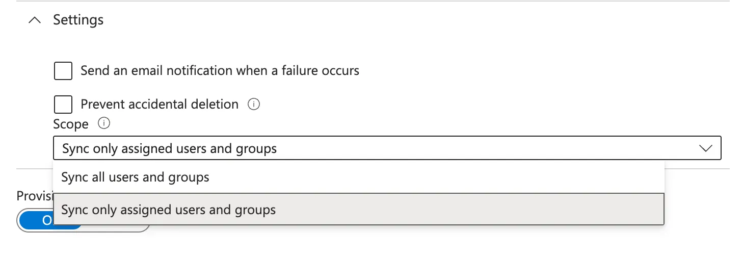 - In Provisioning configuration under the Settings section, From the Scope dropdown, select Sync only assigned users and groups. Toggle the Provisioning Status to On then click Save.