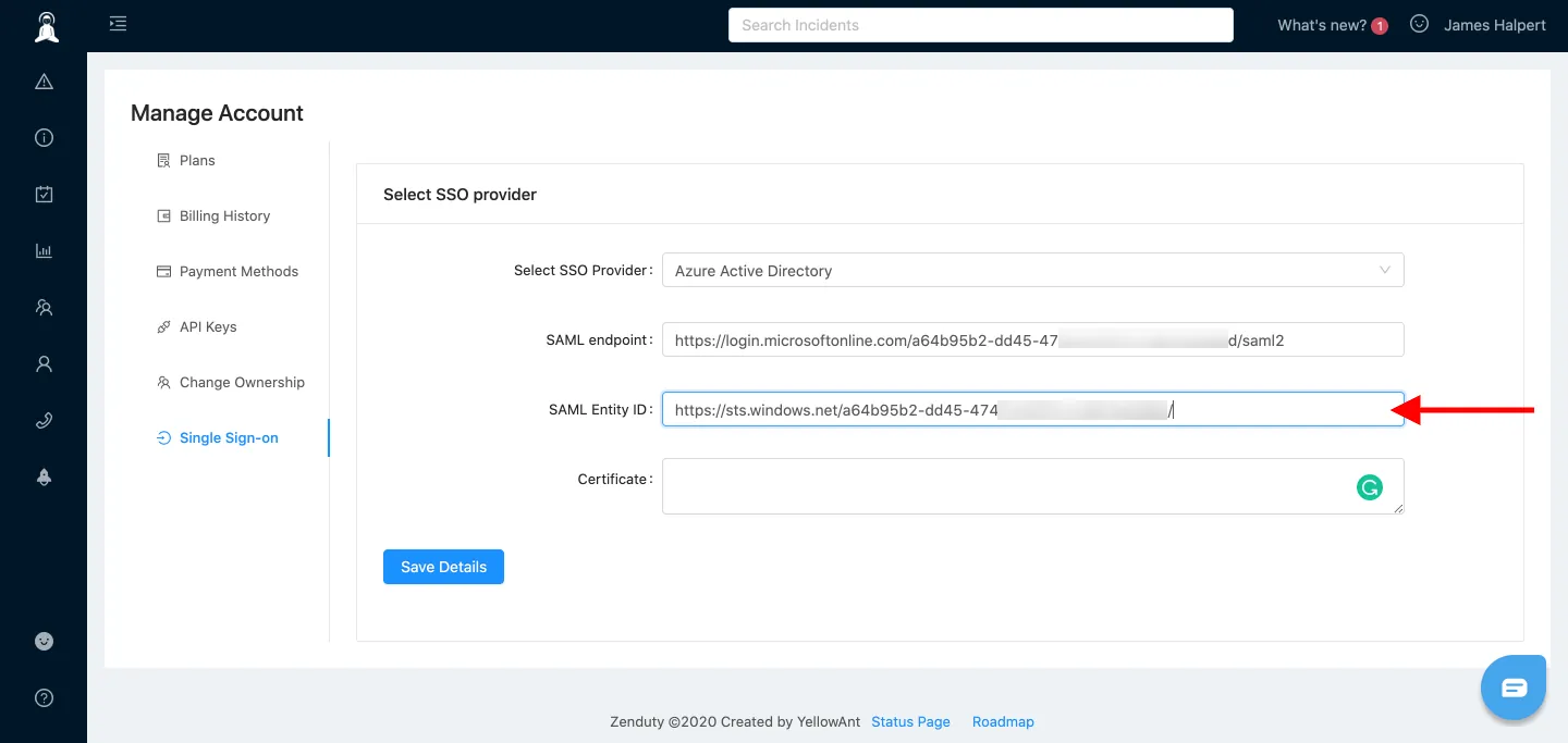 - In the Identifier(Entity Id) input box, enter the value - https://www.zenduty.com