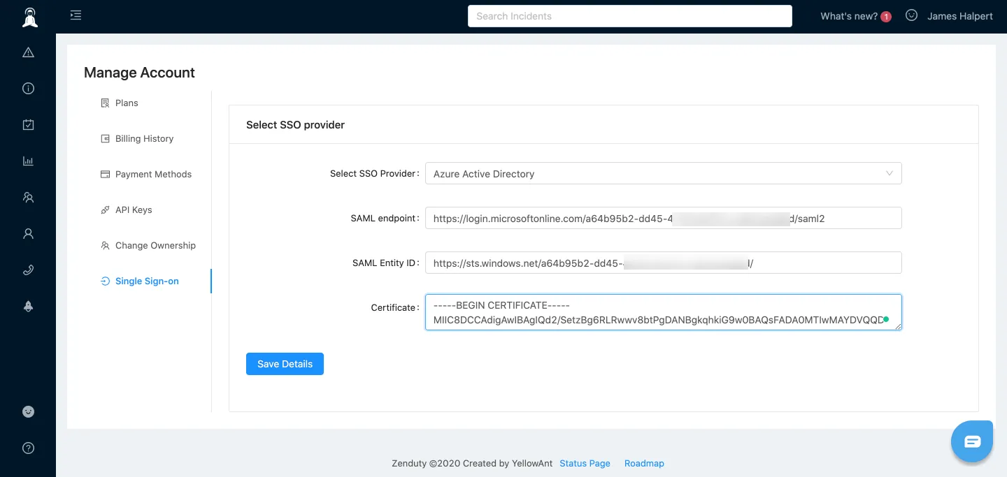 - Go to the Xurrent IMR tab. Navigate to the Account page from your top right dropdown. Navigate to the Single Sign-on page from the left vertical panel. From the Select SSO Provider dropdown, select Azure Active Directory.
