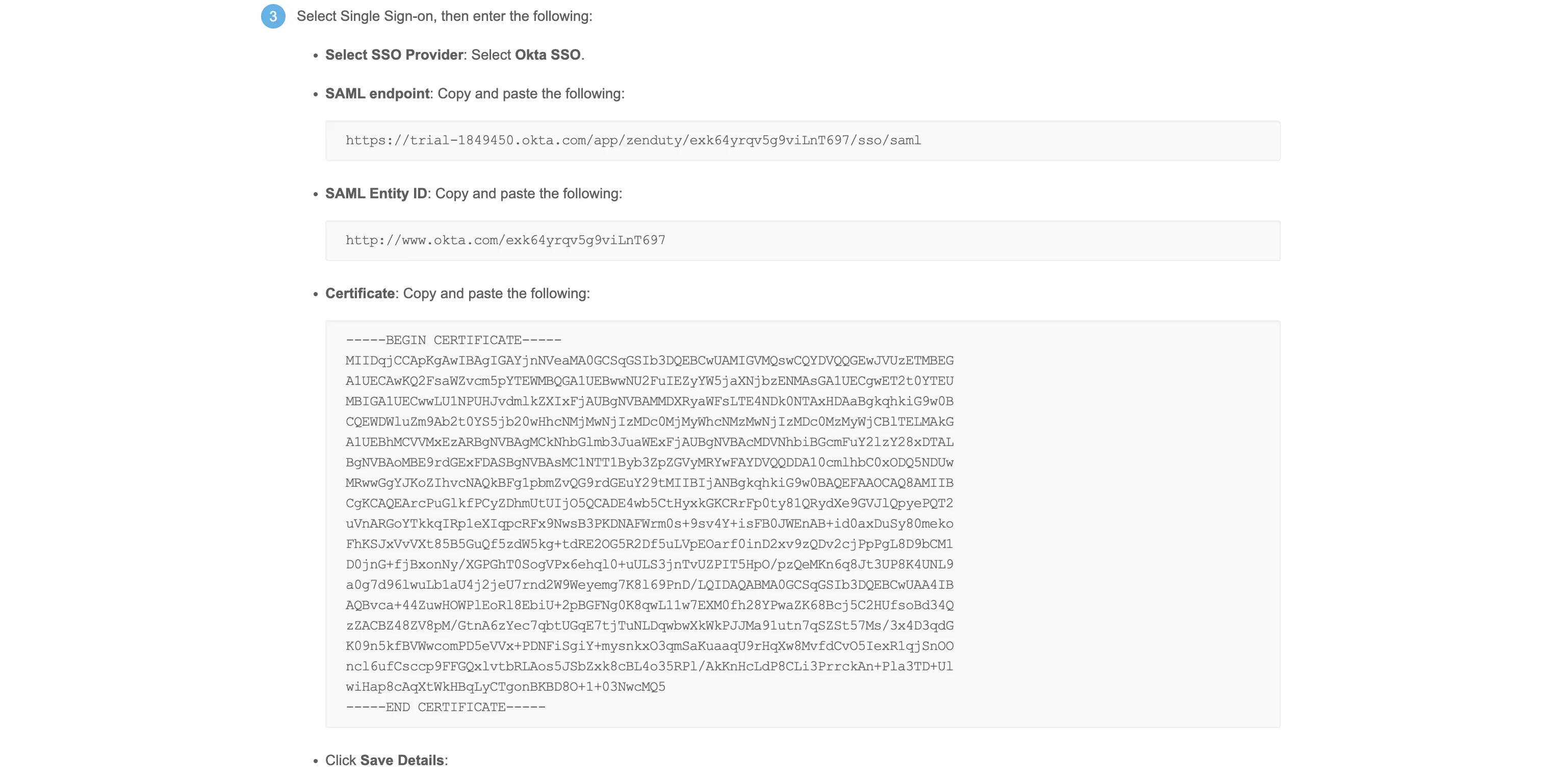- Click on the View SAML Setup Instructions from the right. This will open a new tab which will contain three values which you need to temporarily copy in a text editor for the next step - SAML endpoint, SAML Entity ID and Certificate.