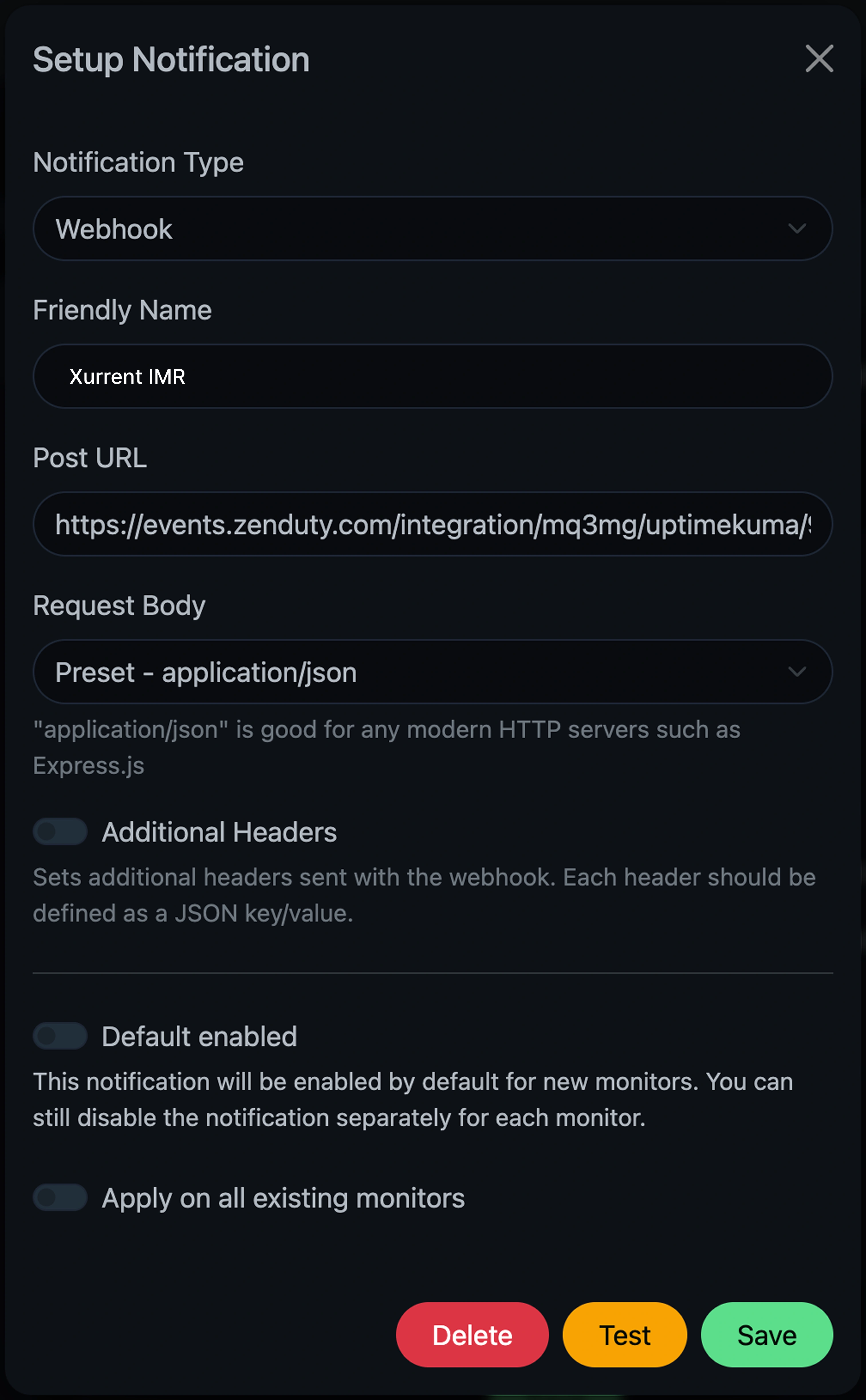 2. Note: Test Notification may not work consistently with Xurrent IMR. To test, invoke a proper alert from Uptime Kuma i.e. create/update a monitor which sends down an alert.