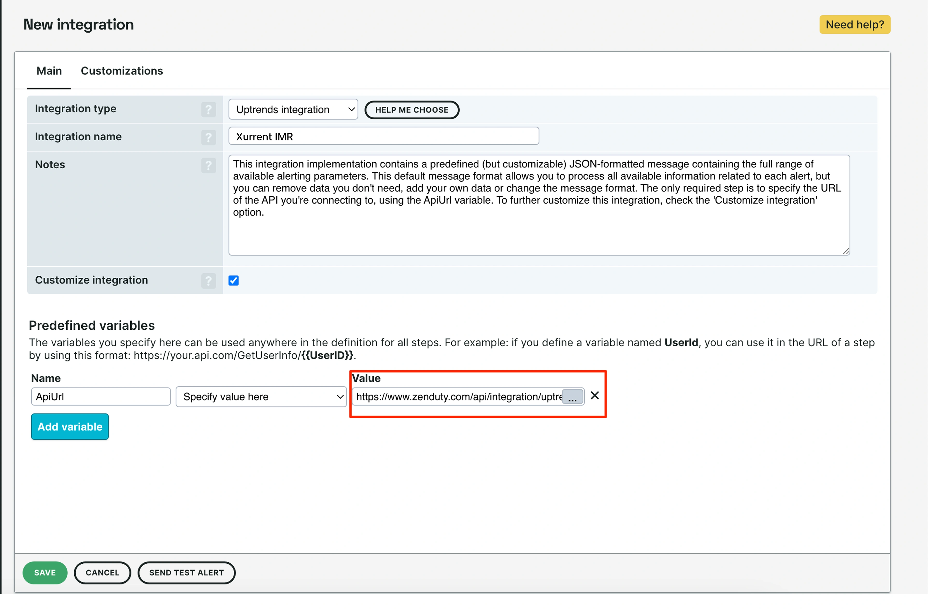1. After naming the integration, under the predefined variable, paste the Webhook URL which you have copied earlier against the variable ApiUrl.