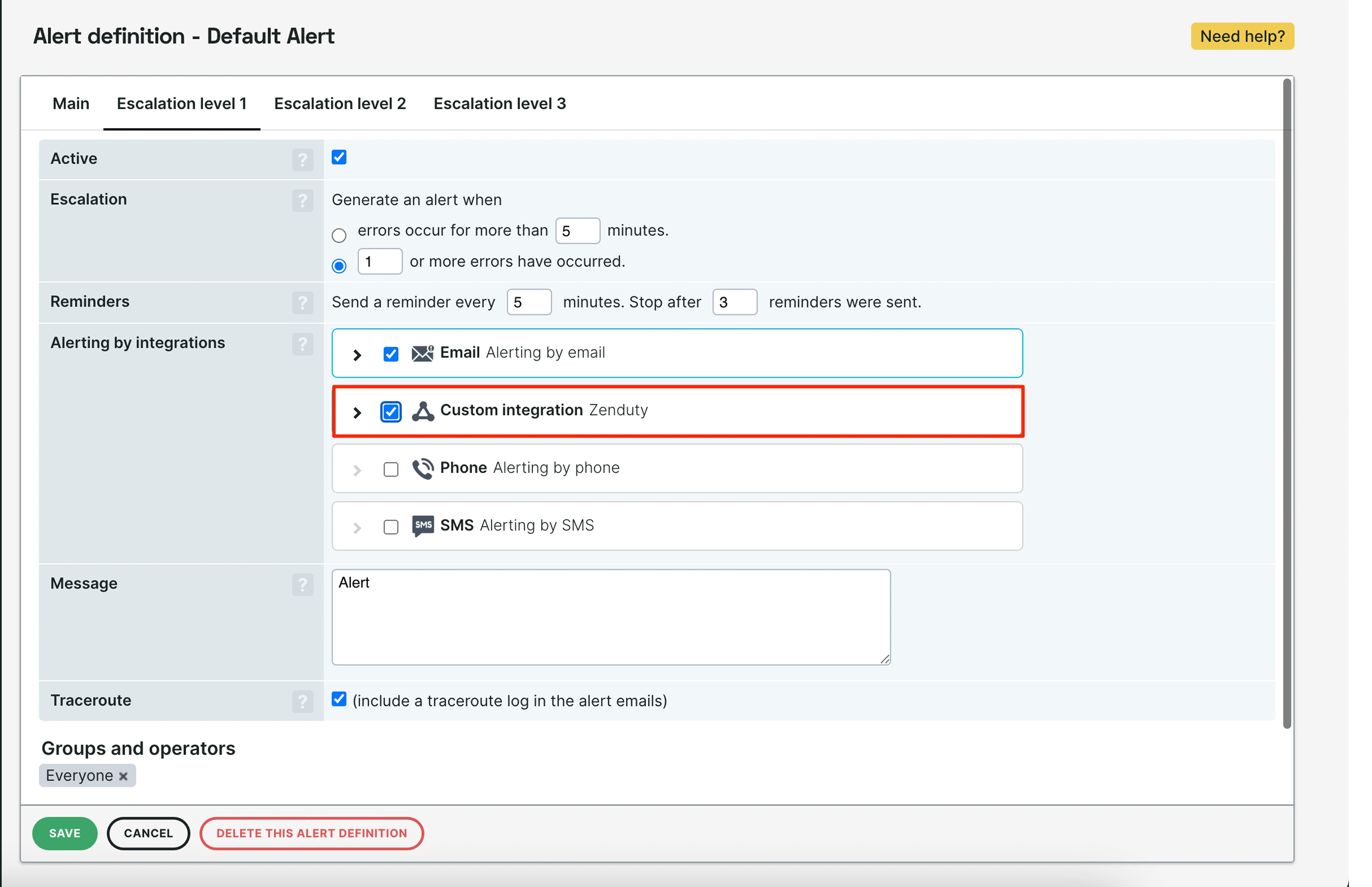3. In the alert definition, select the newly created webhook in the Alerting By Integrations section and then save.