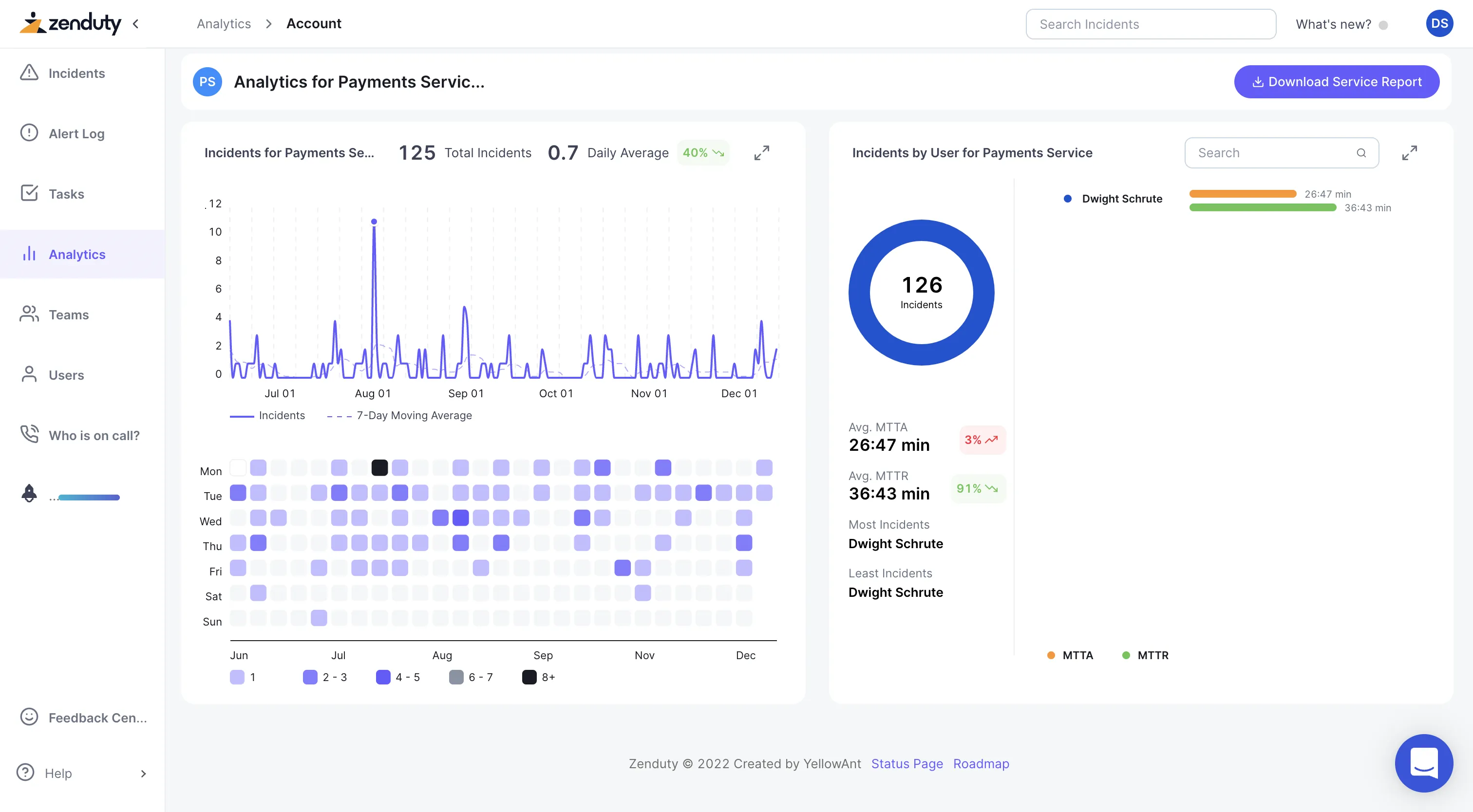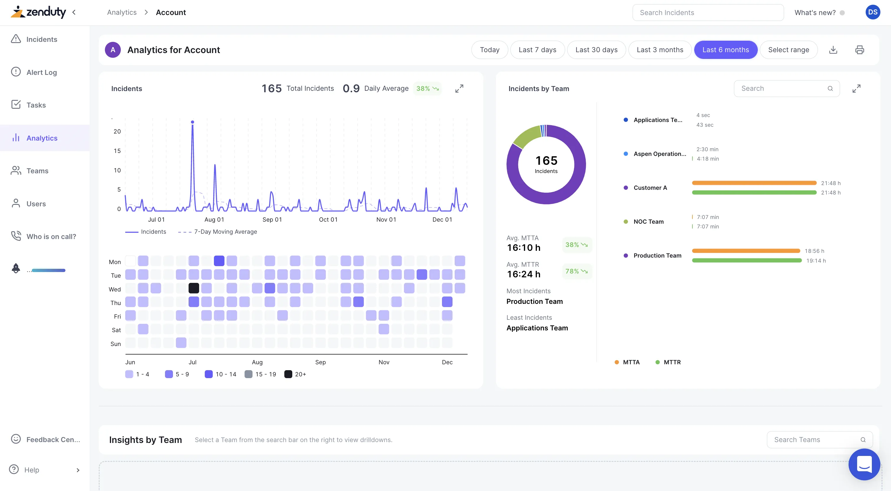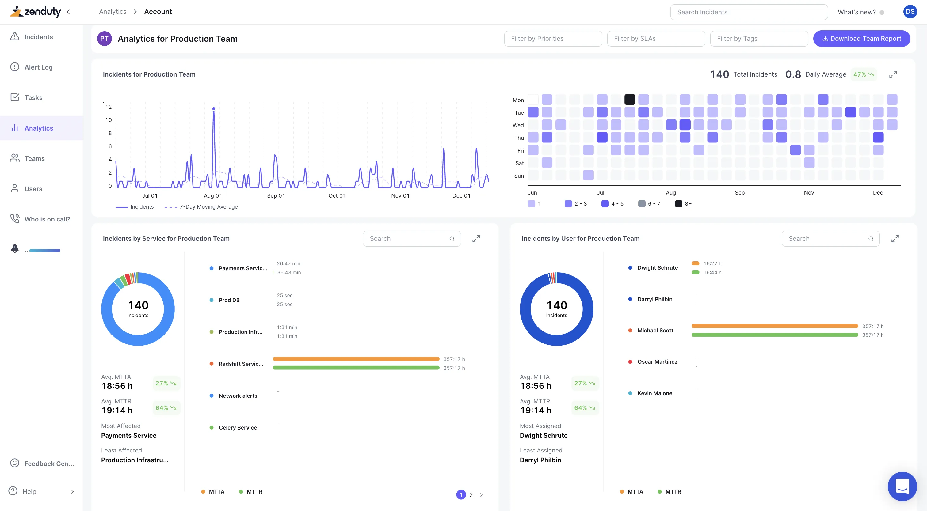 Analytics gives you count of Total Incidents, Average MTTA (Mean Team To Acknowledge) and Average MTTR (Mean Time to Resolve) over the time frame and granuality you select.