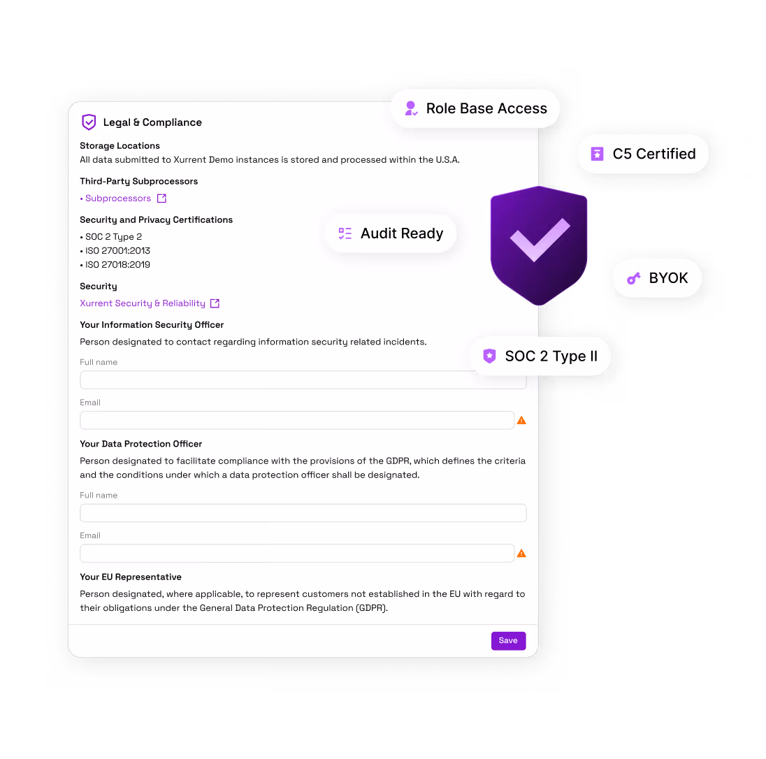 Security is foundational for financial service operations. Xurrent provides strong security controls including role-based access management, encryption, high availability architecture, and support for Bring Your Own Key (BYOK) to give organizations full control over their data protection strategy.