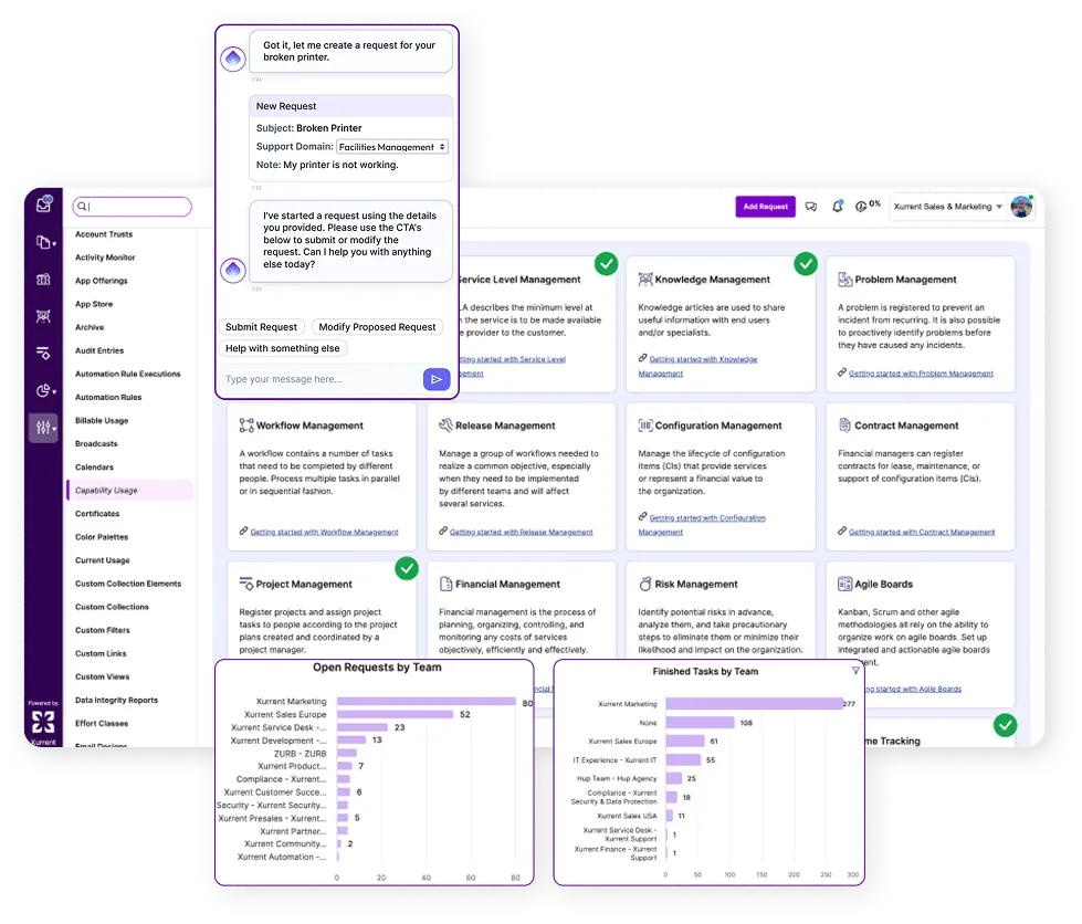 Move beyond reactive ticket queues. Xurrent’s embedded AI continuously analyzes patterns across incidents, assets, and systems to reduce noise, surface root causes faster, and prevent recurring disruptions.