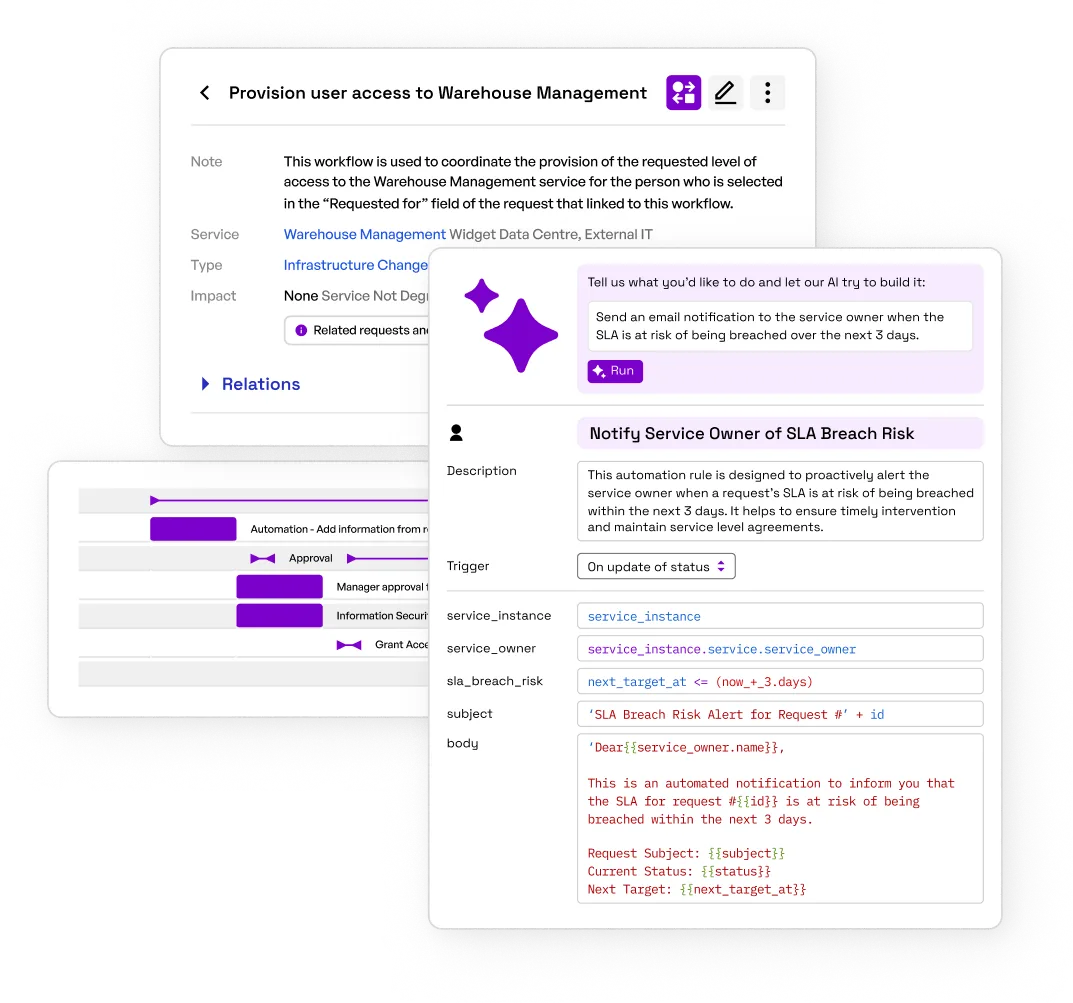 Break down silos between plants, warehouses, suppliers, and IT teams. With Enterprise Service Management, manufacturers can standardize workflows, automate cross-department processes, and coordinate across multiple languages and regions — all within a single platform.