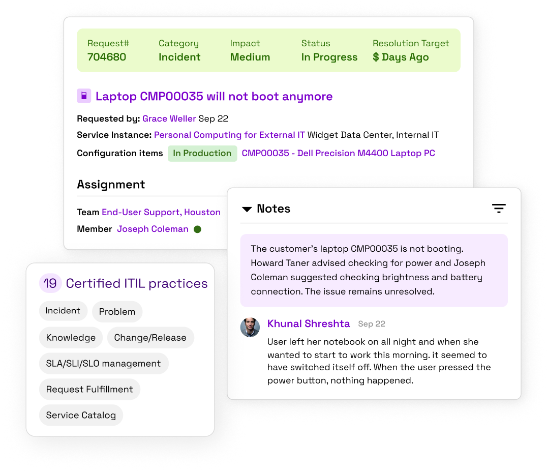- 19 certified ITIL practices built in, including Incident, Problem, Change/Release, Request Fulfillment, and Knowledge Management