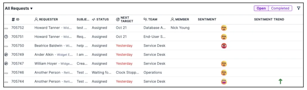 Two new fields are available within requests grids (Sentiment, Sentiment Trend) so that managers can look across multiple requests: