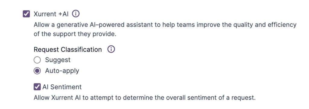 The feature is available as part of the Xurrent+AI capability set and can be toggled off individually: