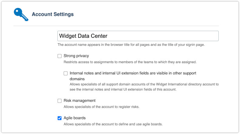 To allow specialists to set up agile boards, the Xurrent account owner will need to check the Agile boards box in the ‘Account Settings’ section of the Settings console.